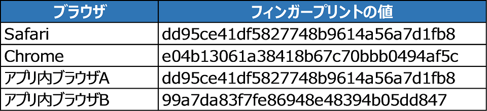 SafariとChromeでは異なる値になります。アプリ内ブラウザ(※)で取得したフィンガープリントは、それぞれのアプリによって異なりました。アプリ内ブラウザAはSafariを利用してブラウザの機能を実装していたようなので、Safariと同じ値が取得できましたが、アプリ内ブラウザBはSafariともChromeとも違う値となっています。今回はuserAgent(ブラウザ名やバージョンを識別するための情報)を利用しているため、ユーザトラッキングするなら、この項目は使わないほうが良さそうです。